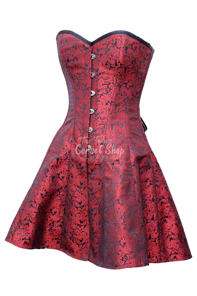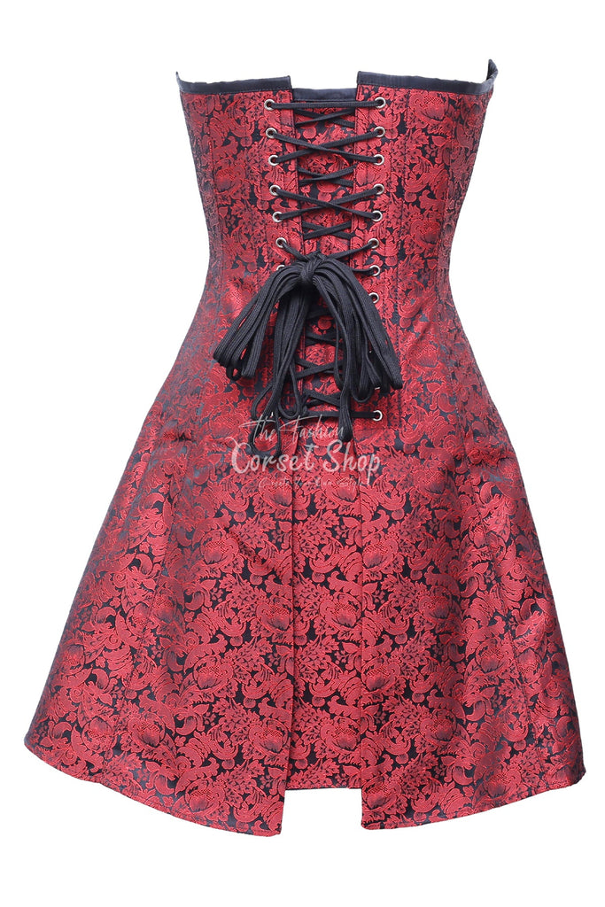 • Authentic Steel Boned Red Black Brocade Overbust Long Corset Dress