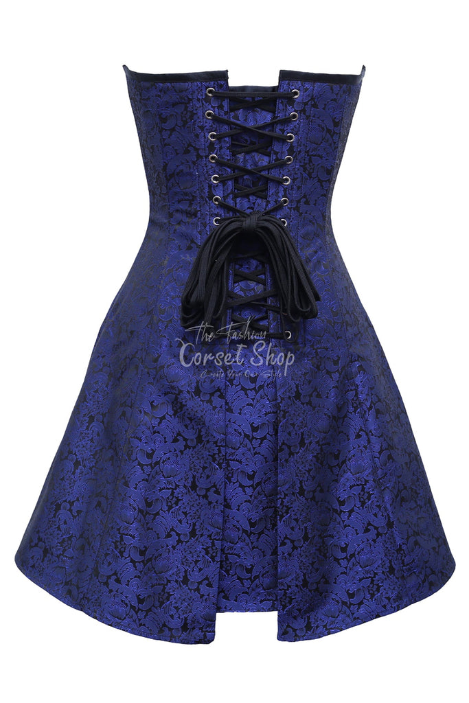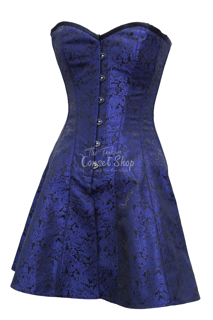 • Authentic Steel Boned Blue Black Brocade Overbust Long Corset Dress