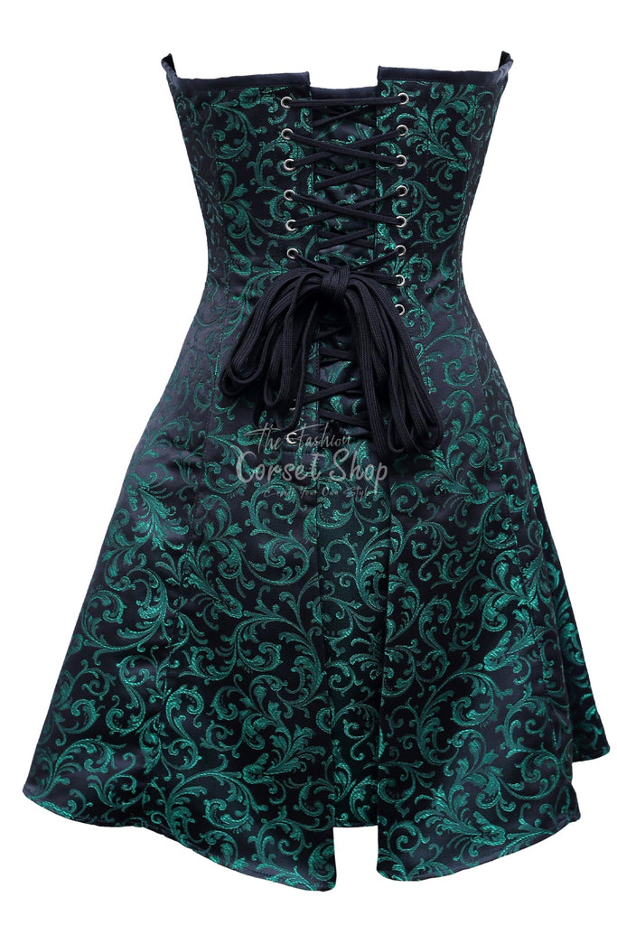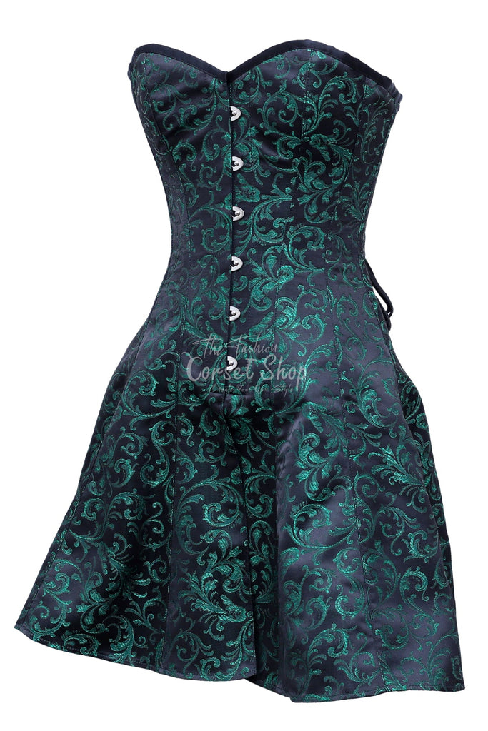 • Authentic Steel Boned Green Black Brocade Overbust Long Corset Dress